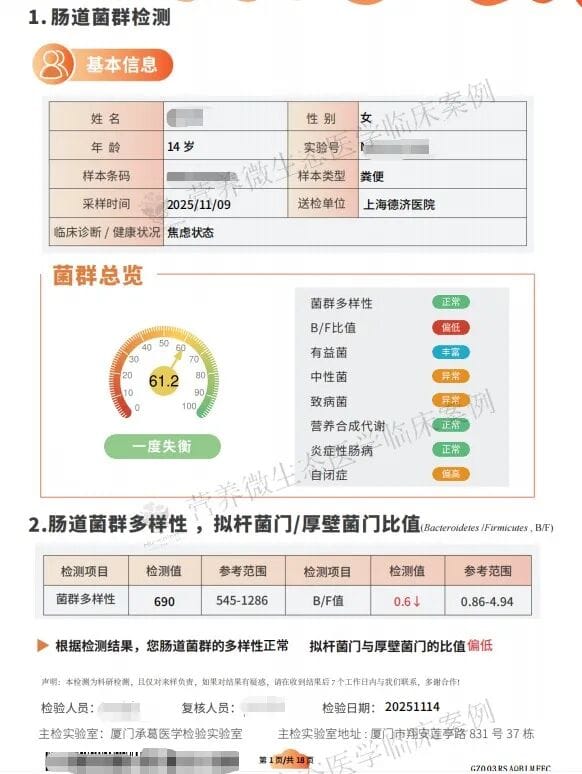 在上海德济医院/青岛大学上海脑科医学中心神经科学“脑-肠轴”微生态诊疗中心,我们接触到越来越多因情绪与学习问题困扰的青少年。他们中不少孩子曾是令人羡慕的“学霸”,却在压力下状态骤降,甚至无法继续学业。14岁的初三女生媛媛(化名,是我朋友家的孩子)就是其中之一——她从成绩优异到因重度焦虑被迫休学,又在营养微生态干预后,短短两个月内重返课堂、恢复稳定。她的转变,不仅再次印证了“肠脑轴”在情绪与认知调节中的关键作用,更想给所有家长一个重要的提醒:孩子的情绪崩溃和学习倒退,根源可能远不止是“心理压力”或“意志不坚”,其背后往往存在着可探查、可干预的肠道菌群的失衡。