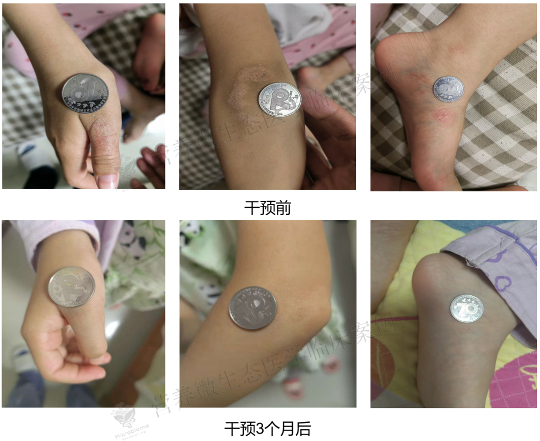 在各种传统治疗方案效果有限的情况下,今年年中,我让小忆尝试了创新性的营养微生态医学干预。考虑到特应性皮炎以免疫调节为主,干预方案为:每天口服能够指导免疫发育、调节免疫平衡[2]的二代菌脆弱拟杆菌制剂,同时联合使用包含朱红硫磺菌 ttys - 997、鼠李糖乳杆菌 TT628、罗伊氏乳杆菌 GYLB - 131 及发酵中药的复合微生态制剂,进行为期 1 个月的干预。随着小忆的皮疹症状逐渐减轻,开始停用复合微生态制剂,仅维持脆弱拟杆菌制剂每天 1 次、每次 1 包的干预,偶尔外用糠酸莫米松软膏作为辅助。