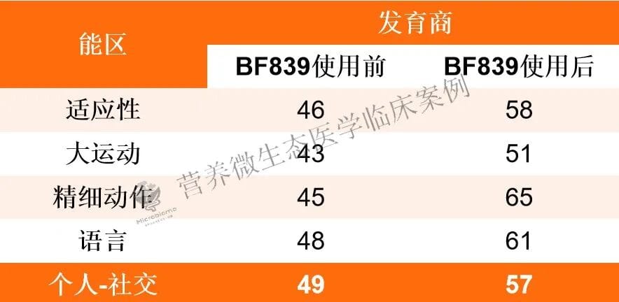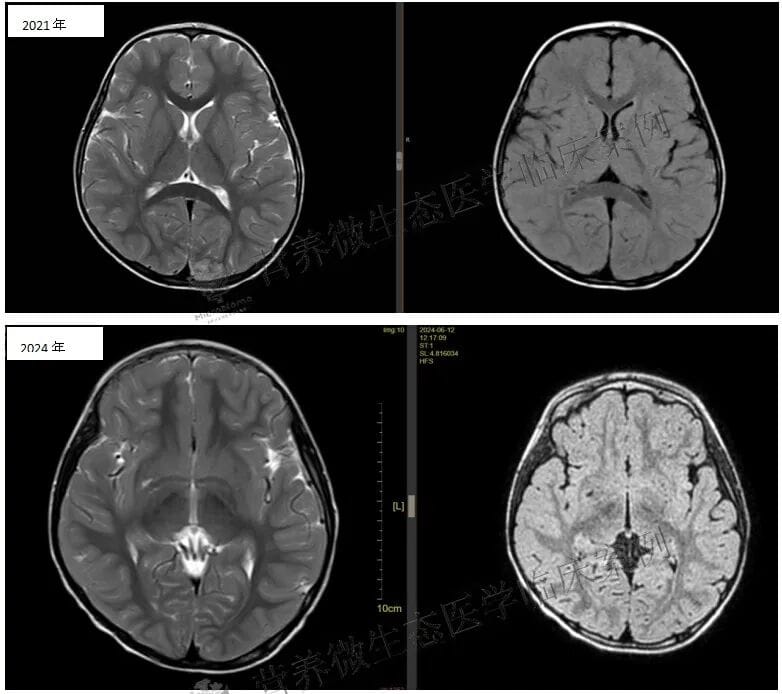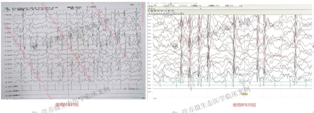 在启动BF839治疗(每日两次,每次一包)后,患儿于首次丙球输注后3个月再次接受了第二次丙种球蛋白治疗,至此共完成两次免疫调节。目前的联合治疗方案(吡仑帕奈、BF839及阶段性丙球)取得了阶段性成效:患儿至今已无临床发作,认知、语言和运动功能较前改善,脑电图放电指数也有所下降。